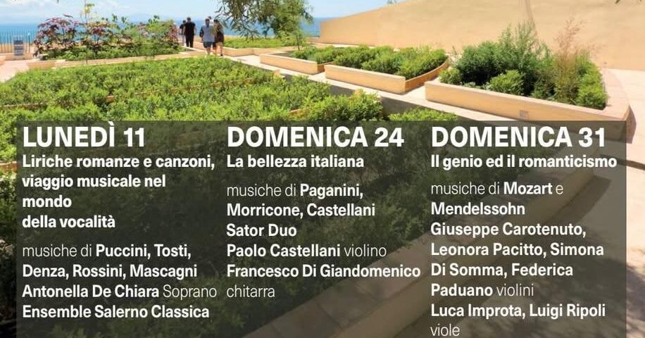 Appuntamento l’11, il 24 e il 31 agosto alle ore 21:15 con artisti e repertori d’eccezione, tra cui il soprano Antonella De Chiara e l’Ensamble Salerno Classica